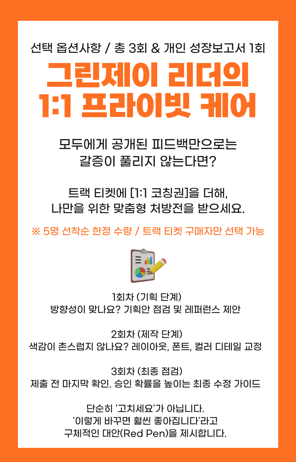 추가로 리더님의 1:1피드백(3회)+성장보고서(1회) 선택옵션(50,000원)을